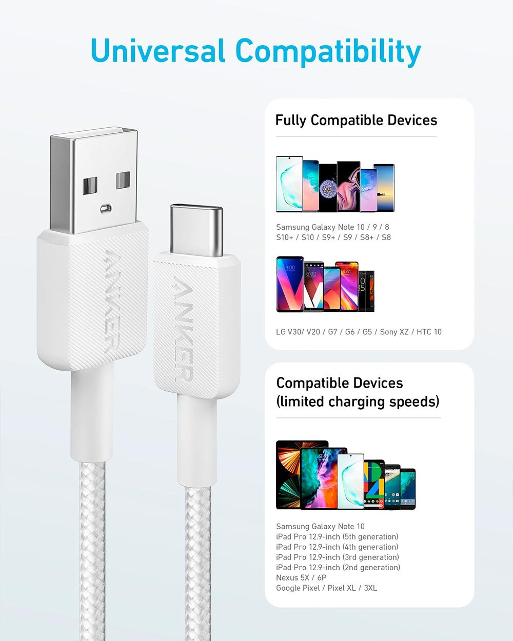 • Anker 322 USB-A to USB-C 15W Cable (3ft) Nylon Braided – A81H5H21 – White