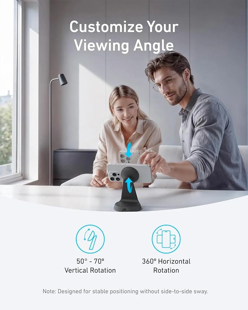 - Easily adjust vertically from 50° to 70° and rotate 360° horizontally to find your perfect angle while charging.