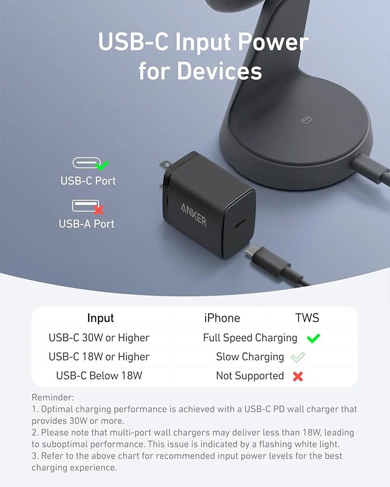 - For optimal performance, use a USB-C charger with a power delivery of 30W or higher.