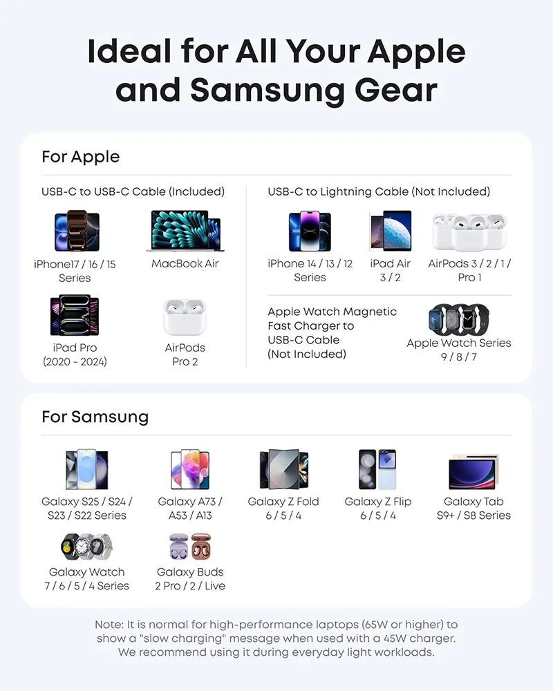 The Anker B2692 is fully compatible with Samsung Super Fast Charging 2.0, allowing users of the Galaxy S24 Ultra and other compatible models to reach their maximum 45W intake. It is equally proficient with Apple hardware, providing rapid charging for the iPhone 15 series and iPad Pro. The included 5ft USB-C to USB-C cable is built to handle the high wattage, ensuring you have the reach and reliability needed for any setup.