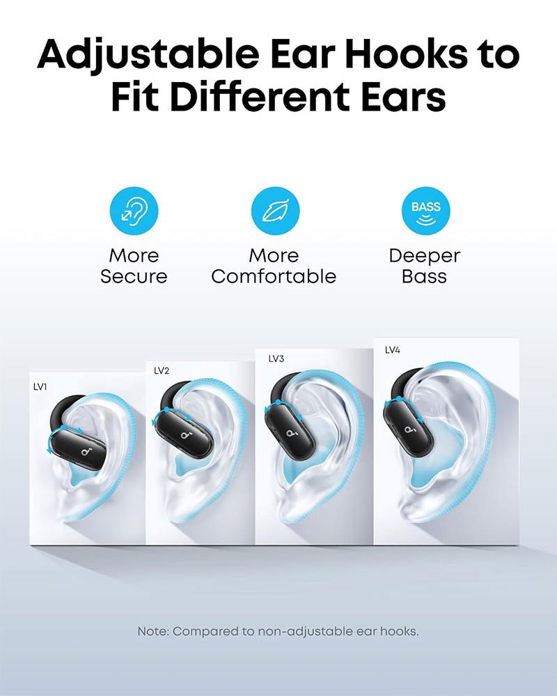 soundcore’s innovative 4-level adjustable ear hooks ensure a comfortable fit tailored to over 99% of ear shapes and sizes.