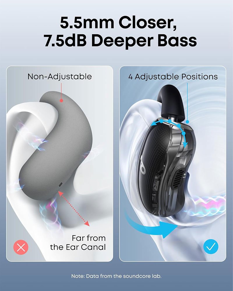 Adjustable ear hooks bring the sound closer, delivering the bass you crave. With a maximum boost of 7.5dB over non-adjustable hooks, enjoy richer, more powerful beats. Note: Data from the soundcore lab.