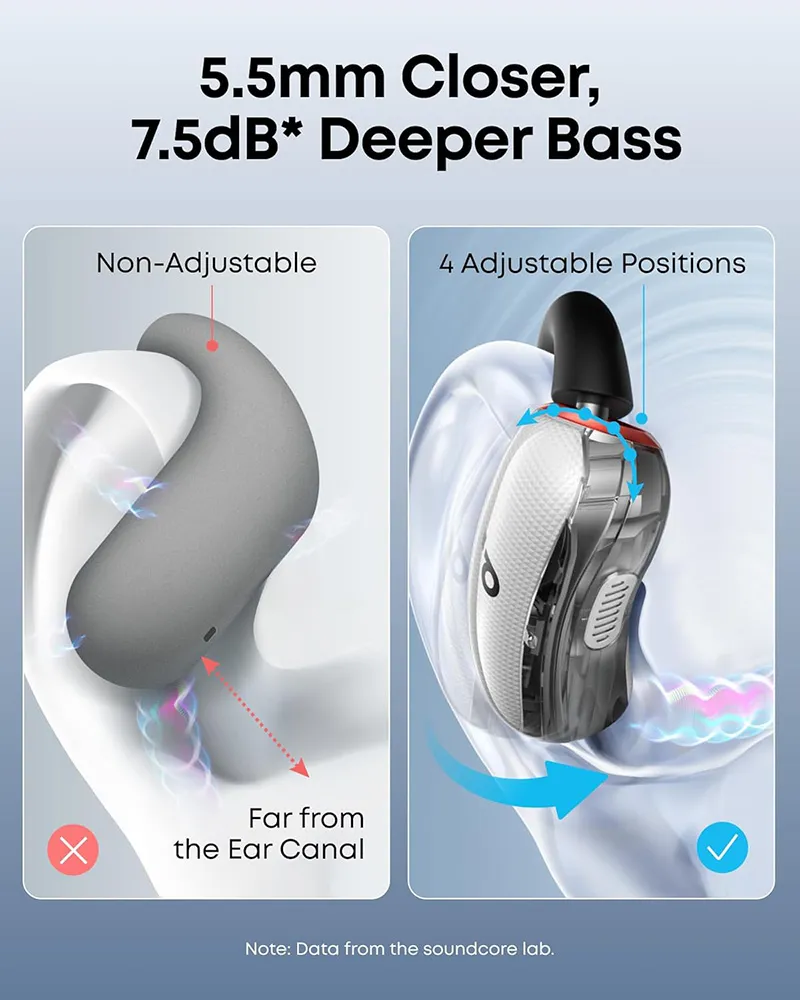 Adjustable ear hooks bring the sound closer, delivering the bass you crave. With a maximum boost of 7.5dB over non-adjustable hooks, enjoy richer, more powerful beats. Note: Data from the soundcore lab.