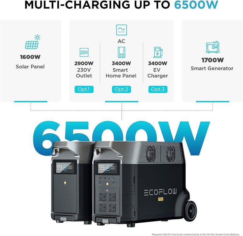 When charging DELTA Pro and its extra battery together, you can reach 6500W max charging speeds by combining AC, solar and Smart Generator methods. For DELTA Pro single unit, you can recharge it at standard wall outlets (2900W max), at EV station (3400W max)/Smart Home Panel (3000W max).