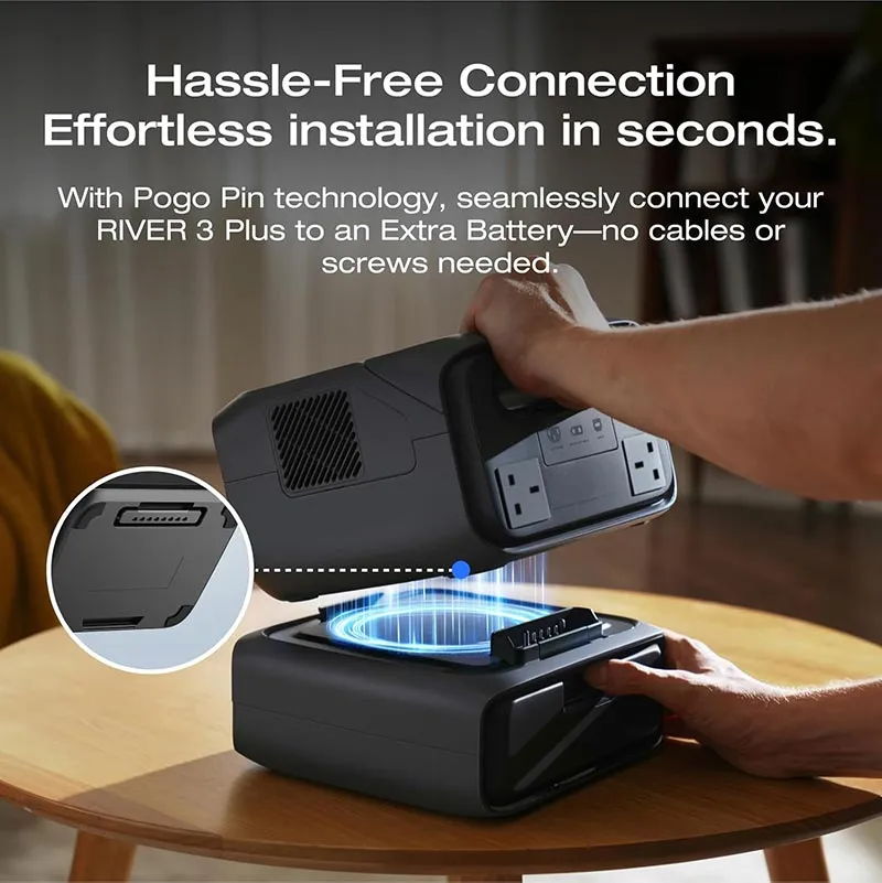 • Wireless Connection: With Pogo Pin technology, attach RIVER 3 Plus with an Extra Battery in seconds—no cables or screws required. Enjoy the simplicity and reliability of wireless clipping, making power expansion effortless and secure.