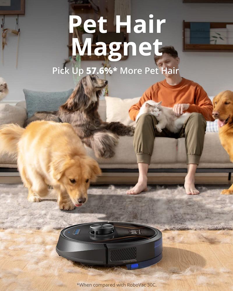 - Twin Turbine Technology: Twin-Turbine Technology: Each turbine offers 2000 Pa of suction power, increasing overall airflow by 80% so your house can go back to looking its best. Clean up to 57.6%* more pet hair with the immense power of the Twin Turbines. *When compared to a single-turbine robotic vacuum.