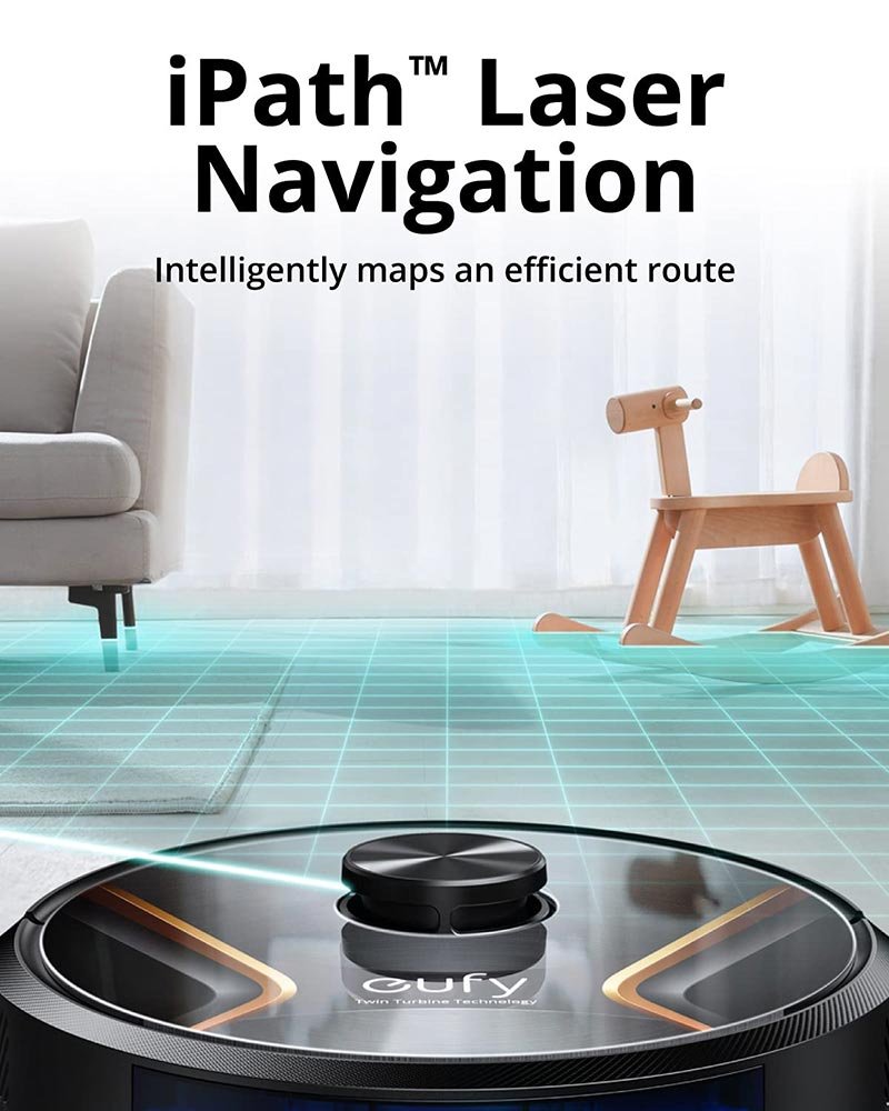 - iPath Laser Navigation: By intelligently memorizing your house environment, RoboVac can quickly build a virtual map to follow for the most efficient cleaning route, without needing you to manually map it out.